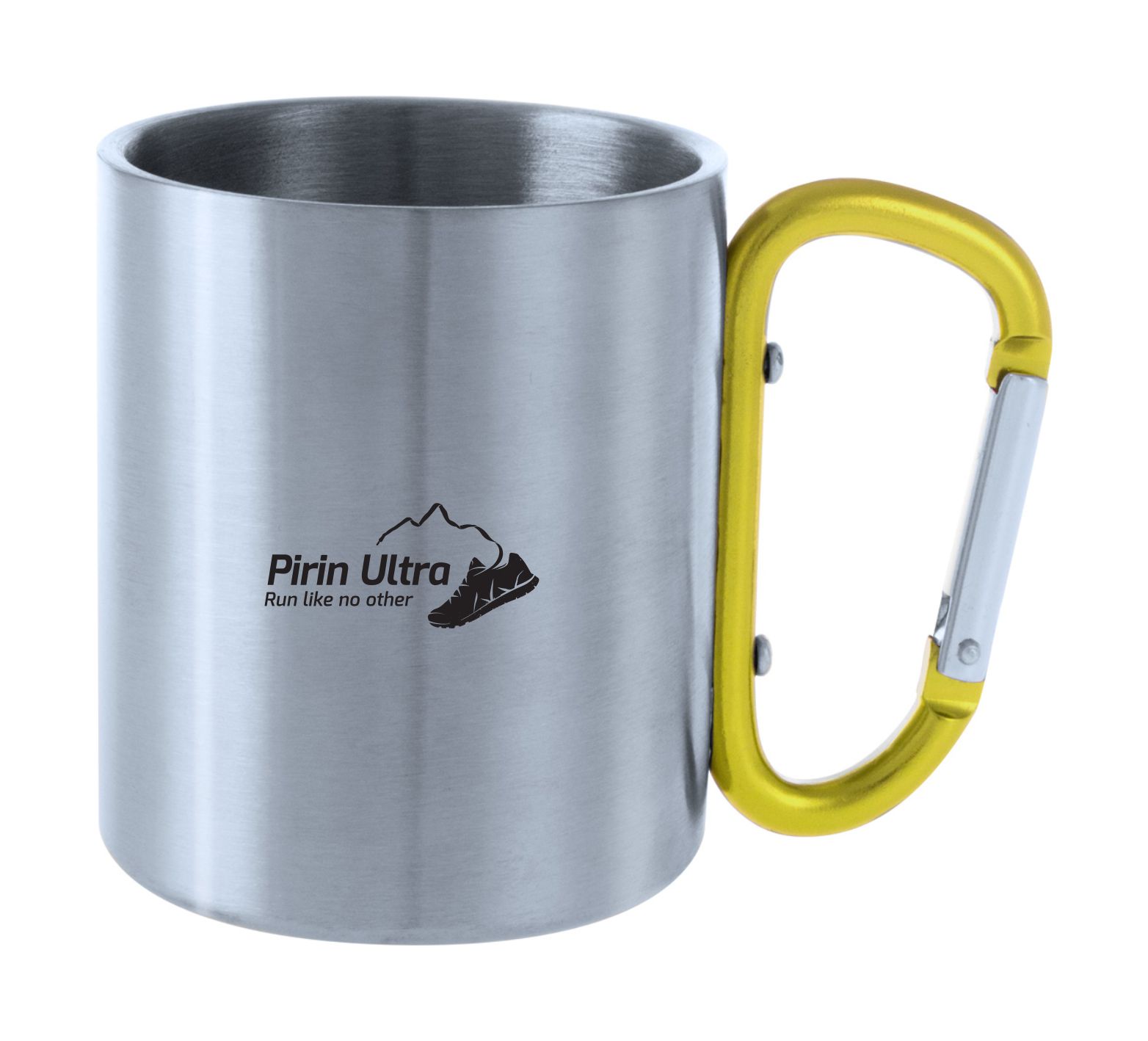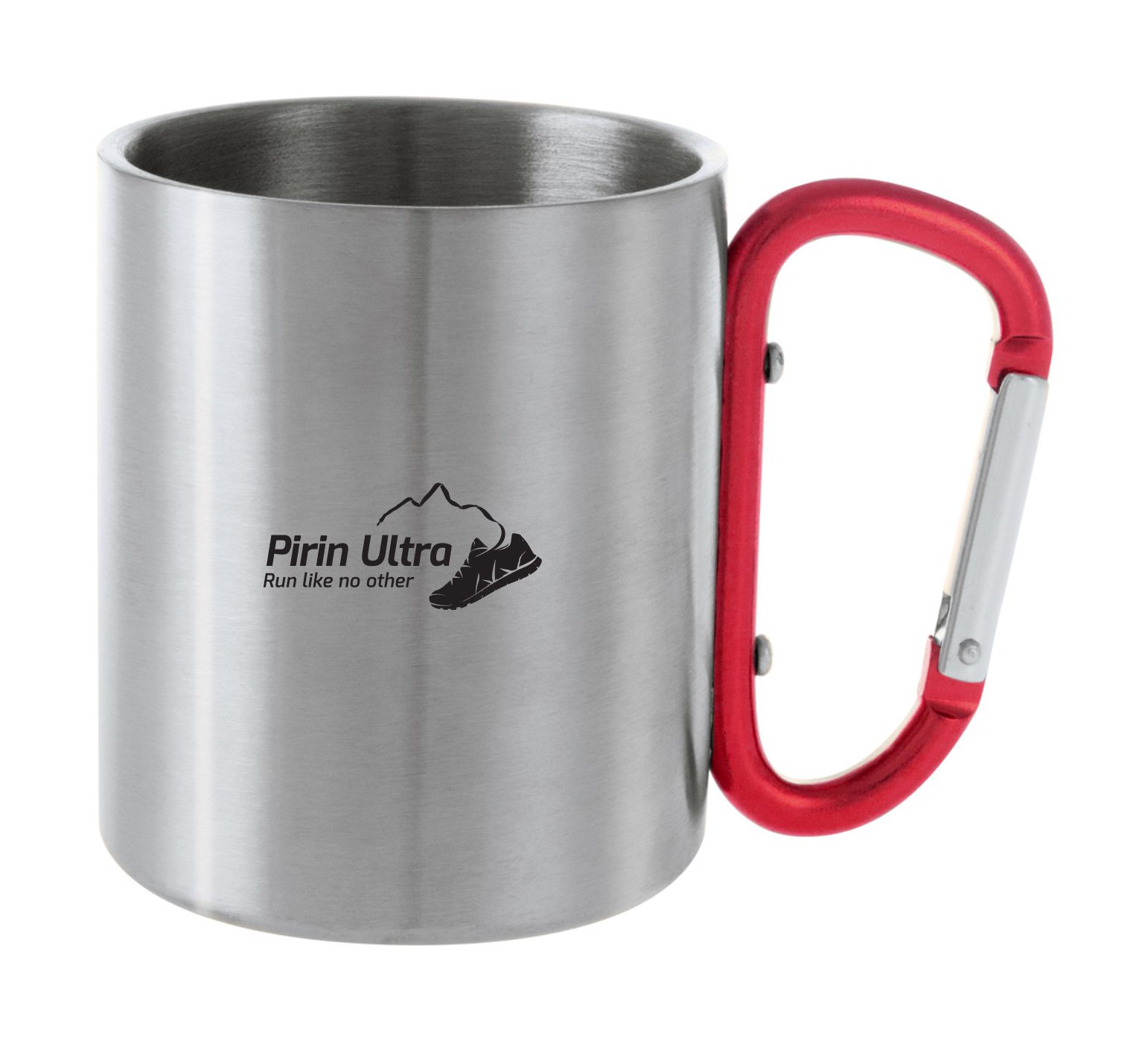 Stainless steel mug with coloured carabiner and Pirin Ultra engraved logo. 200 ml. In gift box.